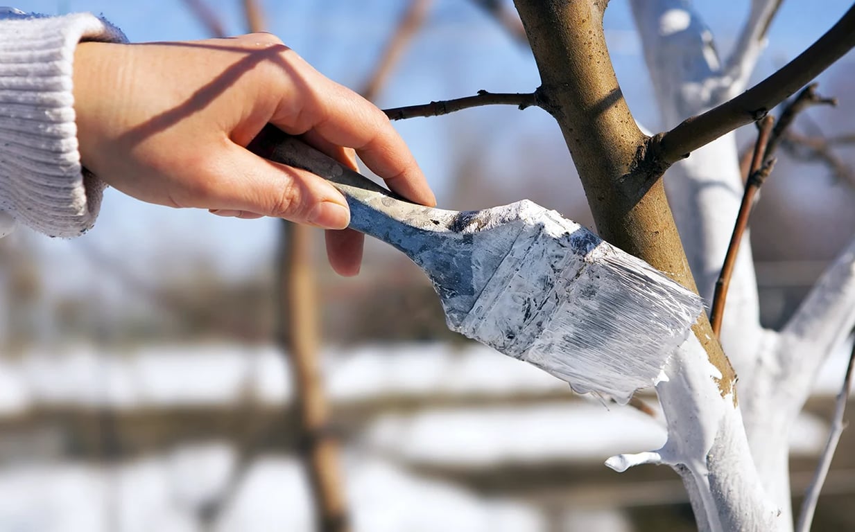 специализированными средствами для побелки деревьев, которые можно купить в магазине.